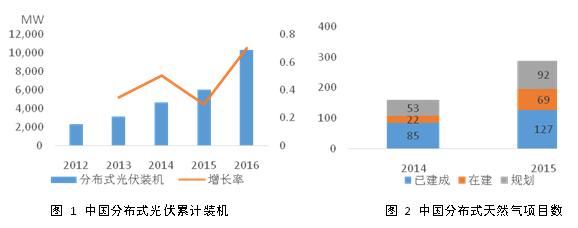 從中國(guó)的視角來(lái)看,隨著中國(guó)經(jīng)濟(jì)發(fā)展進(jìn)入“新常態(tài)”,中國(guó)能源行業(yè)發(fā)展的根本目標(biāo)已是天壤之別。過(guò)去,中國(guó)經(jīng)濟(jì)持續(xù)的高速增長(zhǎng)導(dǎo)致能源供應(yīng)短缺,那時(shí)的時(shí)代主線是擴(kuò)大能源生產(chǎn)以保障供應(yīng);如今,經(jīng)濟(jì)發(fā)展放緩,能源供給能力已遠(yuǎn)超需求,反而是技術(shù)、環(huán)境、價(jià)格、效率等問題制約了進(jìn)一步發(fā)展,中國(guó)能源發(fā)展的問題從數(shù)量問題逐漸轉(zhuǎn)為質(zhì)量問題。短短五年間,中國(guó)見證了可再生能源在裝機(jī)容量方面的爆發(fā)式增長(zhǎng)。然而,嚴(yán)重的“棄風(fēng)棄光”問題成為了限制可再生能源進(jìn)一步發(fā)展的瓶頸。分布式能源的特征符合中國(guó)下一階段能源發(fā)展“提質(zhì)增效”的目標(biāo),因此分布式能源在中國(guó)也顯現(xiàn)了迅猛崛起的勢(shì)頭。分布式光伏累計(jì)裝機(jī)從2012年時(shí)的2.3GW快速上升至2016年底的10.3GW(如圖),年均增長(zhǎng)率高達(dá)46%;分布式天然氣項(xiàng)目數(shù)(包括建成、在建、規(guī)劃)從2014年時(shí)的160個(gè)增長(zhǎng)至2015年底時(shí)的288個(gè)。