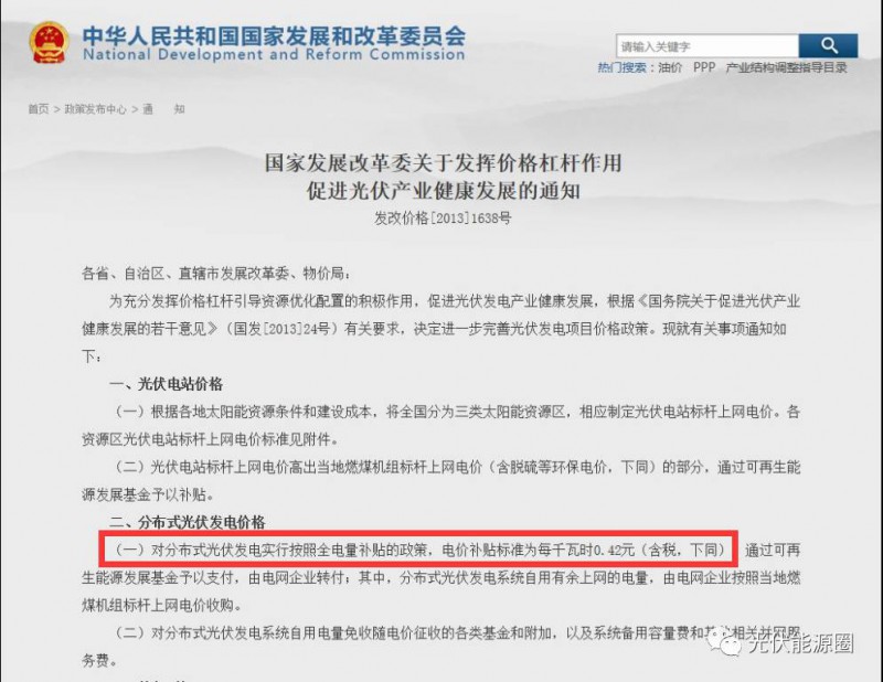 2013年國家發(fā)改委頒布《關(guān)于發(fā)揮價格杠桿作用促進(jìn)光伏產(chǎn)業(yè)健康發(fā)展的通知》,給予安裝家用光伏電站的業(yè)主0.42元/度的補(bǔ)貼。