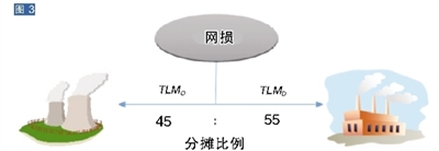 其中TLMD為發(fā)電側(cè)使用的輸電網(wǎng)損乘數(shù),TLM0為用戶側(cè)使用的輸電網(wǎng)損系數(shù)。目前,英國平衡服務(wù)規(guī)則規(guī)定使用的α為0.45,即有45%的輸電網(wǎng)損電量由發(fā)電側(cè)承擔(dān),剩余55%的網(wǎng)損電量由負(fù)荷側(cè)承擔(dān)(見圖3)。