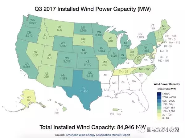 中國儲能網(wǎng)訊:根據(jù)美國風(fēng)能協(xié)會的最新數(shù)據(jù),到2017年9月底止全美風(fēng)電裝機累計達到84.946吉瓦,其中德克薩斯一個州就有21.450吉瓦,占全國總裝機的25%;其次為愛荷華州(6.974吉瓦)、俄克拉荷馬州(6.645吉瓦)、加利福尼亞州(5.561吉瓦)、堪薩斯州(5.110吉瓦)。