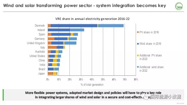 根據(jù)國際能源署(IEA)在最新版的世界能源展望中的情景分析,2022年各國間歇性可再生能源(風電、光伏)發(fā)電的比例可望達到以下的規(guī)模:
