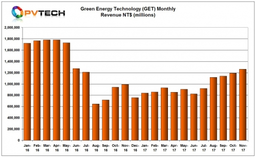 中國(guó)儲(chǔ)能網(wǎng)訊:臺(tái)灣P型多晶硅片生產(chǎn)商綠色能源科技公司(GET)稱(chēng),由于年中需求持續(xù)強(qiáng)勁,2017年11月,銷(xiāo)售額保持穩(wěn)健上升趨勢(shì)。