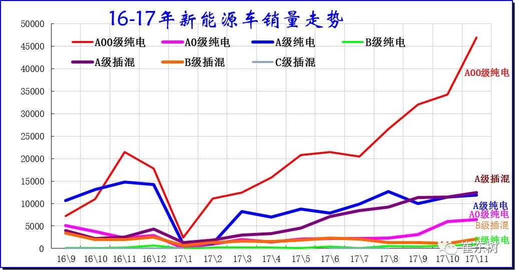 目前的純電動A00級車成為車市的絕對主力車型,增長表現(xiàn)突出,而16年A級電動車表現(xiàn)也較強,雖然17年9月調整,但10-11月仍較快穩(wěn)定并恢復。