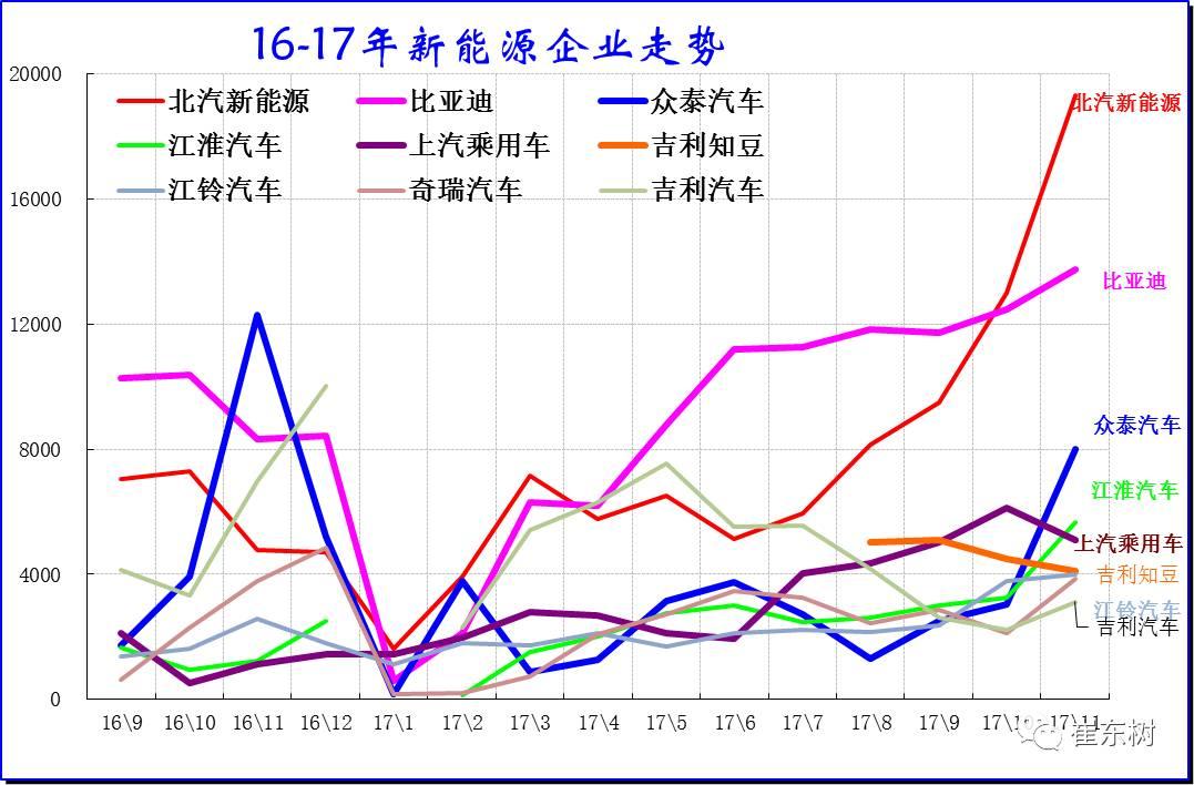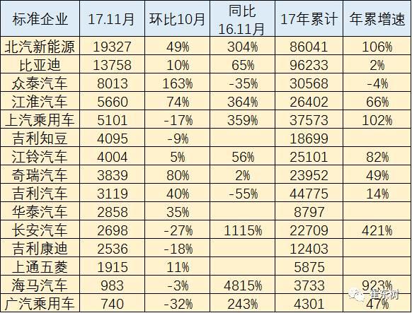 17年11月的新能源車廠家銷量分化。部分新勢力新能源企業(yè)表現(xiàn)較強,16年11月主力企業(yè)銷量收縮。而17年的北汽、比亞迪都是很努力增量,眾泰去年11月就很強,今年仍是很強。江淮的新能源也是提升很猛。