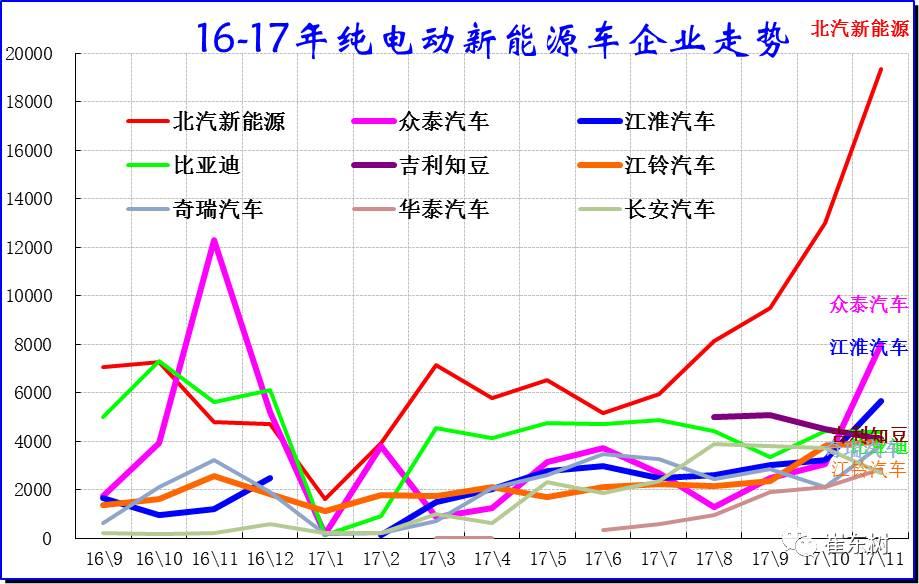 17年純電動新能源車企業(yè)的表現(xiàn)較強,尤其是以北汽和江淮等主力國企的新能源表現(xiàn)較強。民企的眾泰也是表現(xiàn)較優(yōu)秀。