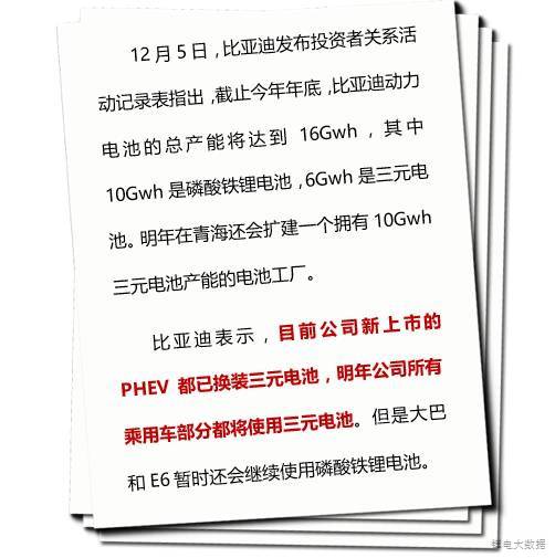 ③明年,比亞迪的乘用車全部換裝三元電池:比亞迪表示,目前公司新上市的PHEV都已換裝三元電池,明年公司所有乘用車部分都將使用三元電池。大巴和E6暫時(shí)還會(huì)繼續(xù)使用磷酸鐵鋰電池。