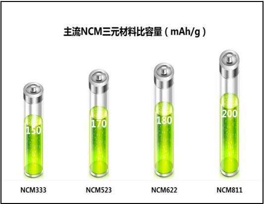 據(jù)統(tǒng)計(jì),三元NCM(鎳鈷錳)目前有333、523、622、811四種型號(hào),作為主要活性元素的鎳含量越高,電池的容量?jī)?yōu)勢(shì)越顯著: