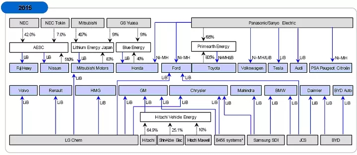 其實,這些國際主流汽車廠商在電動汽車方面的戰(zhàn)略布局,還可以從他們跟電池汽車的關聯(lián)上管中窺豹。從HEV到PHEV再發(fā)展到EV,動力電池系統(tǒng)的成本比重越來越大,特斯拉ModelS的動力電池系統(tǒng)成本就已經(jīng)接近整車成本的60%。毫無疑問,動力電池系統(tǒng)是純電動汽車最為核心的部件,對于任何有志于在鋰電純電動車汽車上有所作為的國際主流車企,他們無論如何是不會讓這個最為關鍵的核心部件被外人掌控的。那么,國際主流汽車公司跟電池企業(yè)的關聯(lián),就是破解這些主流汽車廠家在純電動汽車方面戰(zhàn)略布局的一把鑰匙。