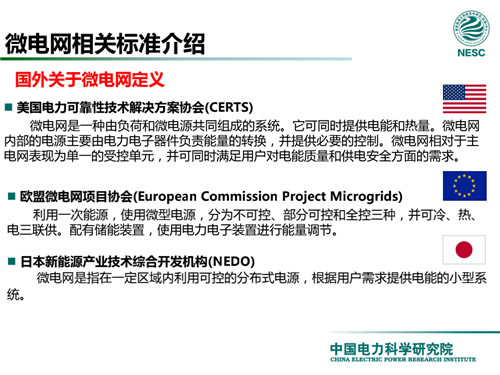赫衛(wèi)國主任首先梳理了不同國家關(guān)于微電網(wǎng)的定義,美國電力可靠性技術(shù)解決方案協(xié)會(CERTS)認(rèn)為,微電網(wǎng)是一種由負(fù)荷和微電源共同組成的系統(tǒng)。它可同時提供電能和熱量。微電網(wǎng)內(nèi)部的電源主要由電力電子器件負(fù)責(zé)能量的轉(zhuǎn)換,并提供必要的控制。微電網(wǎng)相對于主電網(wǎng)表現(xiàn)為單一的受控單元,并可同時滿足用戶對電能質(zhì)量和供電安全方面的需求。而歐盟微電網(wǎng)項目協(xié)會(European Commission Project Microgrids) 則認(rèn)為微電網(wǎng)能夠利用一次能源,使用微型電源,分為不可控、部分可控和全控三種,并可冷、熱、電三聯(lián)供。配有儲能裝置,使用電力電子裝置進(jìn)行能量調(diào)節(jié)。日本新能源產(chǎn)業(yè)技術(shù)綜合開發(fā)機(jī)構(gòu)(NEDO)將微電網(wǎng)定義為,一定區(qū)域內(nèi)利用可控的分布式電源,根據(jù)用戶需求提供電能的小型系統(tǒng)。