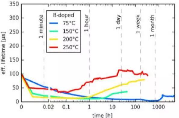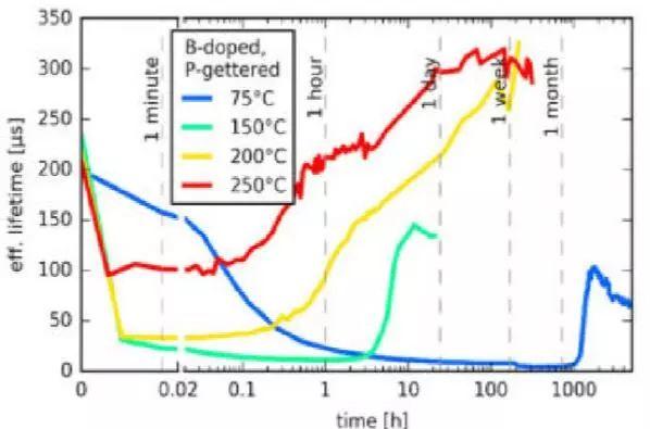 而在電池已經(jīng)形成后,LeTID經(jīng)過長期輻照可以恢復(fù),故可以通過光照退火處理,強(qiáng)光+高溫處理可以快速恢復(fù)光衰。但是,在光照退火時(shí),溫度也不能過高,存在一個(gè)溫度閾值,因?yàn)檫^高的加速恢復(fù)溫度會(huì)導(dǎo)致二次光衰。燒結(jié)退火和激光退火均可改善電池的光衰,而激光退火可以加快光衰的恢復(fù),實(shí)驗(yàn)顯示激光退火+燒結(jié)退火可以徹底消除光衰。