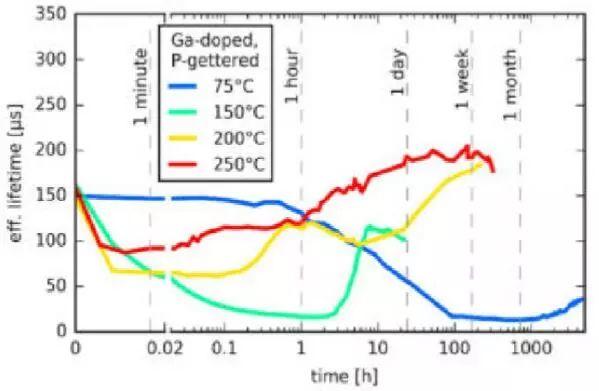 最近德國Konstanz大學(xué)發(fā)表了一篇報(bào)告,證實(shí)多晶PERC電池的LeTID光衰與B-O對并不完全相關(guān)。Konstanz大學(xué)做了三個(gè)實(shí)驗(yàn)對比,分別測試僅摻硼(B)的電池、摻硼并進(jìn)行磷(P)吸雜的電池、摻鎵(Ga)并進(jìn)行磷吸雜的電池在不同溫度下的少子壽命(少子壽命降低說明存在光衰現(xiàn)象)。結(jié)果發(fā)現(xiàn),摻硼和摻鎵的多晶PERC電池都存在LeTID光衰,只不過摻鎵電池的LeTID小于摻硼電池;磷吸雜和非磷吸雜的電池都存在LeTID光衰,但是磷吸雜的電池中少子壽命更高。