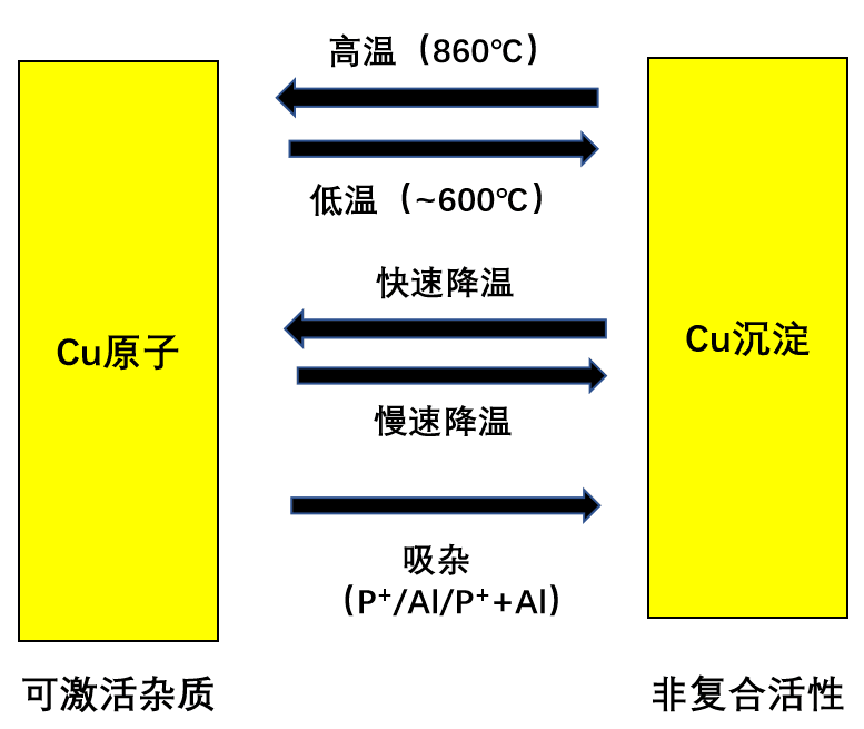 Bredemeier等人發(fā)現(xiàn)當(dāng)使用較低的溫度燒結(jié)(600℃)時(shí)電池光衰較低,而使用較高溫度燒結(jié)(900℃)時(shí)會(huì)造成較強(qiáng)的光衰,低溫二次退火(620℃~660℃)可以減少光衰。此外,Eberle等人發(fā)現(xiàn)快速冷卻會(huì)導(dǎo)致較強(qiáng)的光衰,而慢速冷卻導(dǎo)致較弱的光衰。這是由于高溫處理會(huì)使Cu沉淀溶解為Cu原子,Cu原子是可激活雜質(zhì),導(dǎo)致Cu擴(kuò)散到周圍,光衰加強(qiáng),而低溫退火和慢速冷卻會(huì)形成較大的Cu沉淀,降低光衰。