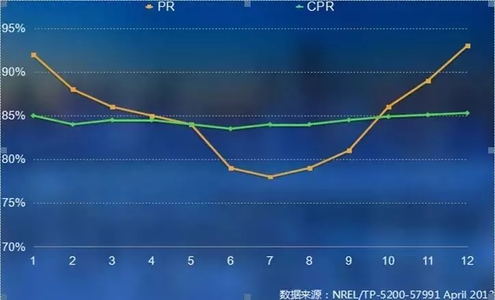 將一年內(nèi)的PR值和CPR值作圖發(fā)現(xiàn),PR值在冬季和夏季非常高,而CPR值在一年內(nèi)相對(duì)平緩,可見CPR值有助于衡量一個(gè)電站一段時(shí)間內(nèi)的運(yùn)行水平。