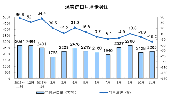 11月份,進(jìn)口煤炭2205萬噸,同比下降18.2%,降幅比10月份擴(kuò)大16.9個(gè)百分點(diǎn)。1-11月份,進(jìn)口煤炭2.5億噸,同比增長8.5%。