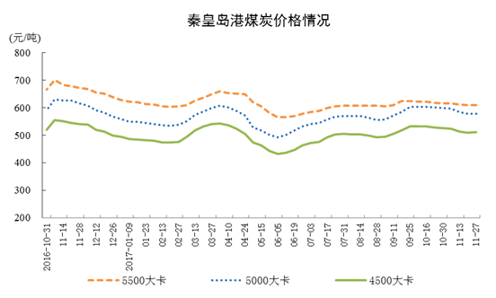 截至11月底,秦皇島5500大卡煤炭平倉價(jià)609元/噸,比10月底下降7元/噸;5000大卡578元/噸,下降20元/噸;4500大卡512元/噸,下降14元/噸。