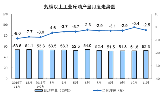 原油生產(chǎn)降幅擴(kuò)大。11月份,原油產(chǎn)量1570萬噸,同比下降2.5%,降幅比10月份擴(kuò)大2.1個(gè)百分點(diǎn);日均產(chǎn)量52.3萬噸,同比減少1.3萬噸。1-11月份,原油產(chǎn)量1.8億噸,同比下降4.1%。