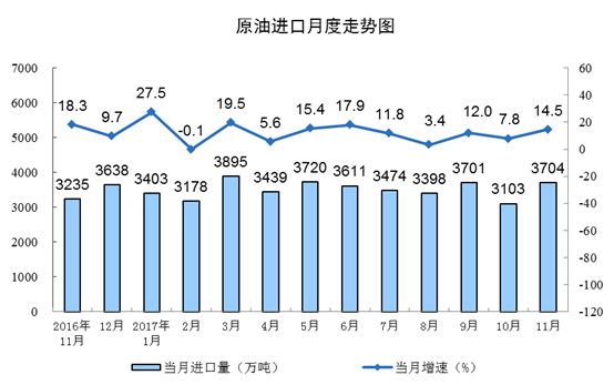 原油進(jìn)口增速加快。11月份,進(jìn)口原油3704萬噸,同比增長14.5%,增速比10月份加快6.7個(gè)百分點(diǎn)。1-11月份,進(jìn)口原油3.9億噸,同比增長12.0%。