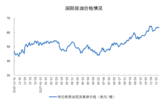 原油價(jià)格持續(xù)回升。11月份,布倫特原油現(xiàn)貨離岸價(jià)格穩(wěn)定在60美元/桶以上。截至11月30日,價(jià)格為63.5美元/桶,比10月底上漲2.2美元/桶。