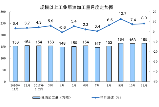 原油加工量增速略有加快。受成品油市場需求和價(jià)格上漲等因素影響,原油加工量保持較快增長,11月份同比增長8.0%,增速比10月份加快0.6個(gè)百分點(diǎn);日均加工量164.8萬噸,同比增加12.2萬噸。主要成品油產(chǎn)量均保持正增長,汽油、煤油和柴油同比分別增長7.7%、3.7%和3.5%。1-11月份,原油加工量5.2億噸,同比增長5.2%。