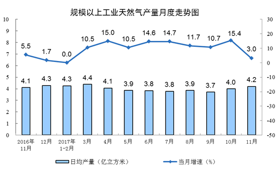 天然氣生產(chǎn)繼續(xù)增長,但增速有所回落。11月份,天然氣產(chǎn)量126.3億立方米,同比增長3.0%,受同期基數(shù)較高影響,增速比10月份回落12.4個(gè)百分點(diǎn);日均生產(chǎn)4.2億立方米,同比增加0.1億立方米。1-11月份,天然氣產(chǎn)量1338.1億立方米,同比增長9.1%。