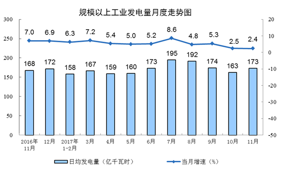 11月份,規(guī)模以上工業(yè)原煤生產(chǎn)同比下降,原油生產(chǎn)降幅略有擴(kuò)大,天然氣生產(chǎn)增速放緩,電力生產(chǎn)基本穩(wěn)定。