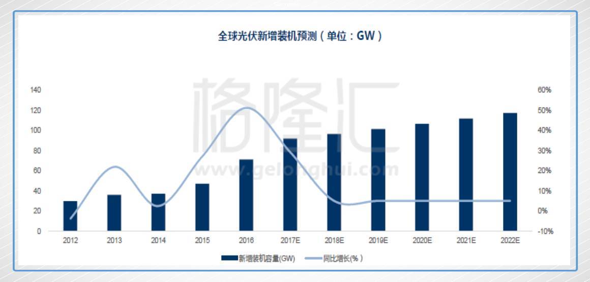 由于光伏過去遠(yuǎn)超計劃的裝機量,2018年到2022年全球光伏市場需求同比增長將實現(xiàn)階段性平穩(wěn),預(yù)計2017年全球光伏新增裝機92GW,同比增長29.22%。2018年新增裝機穩(wěn)定增長,年均增長率將回落到5%~6%。