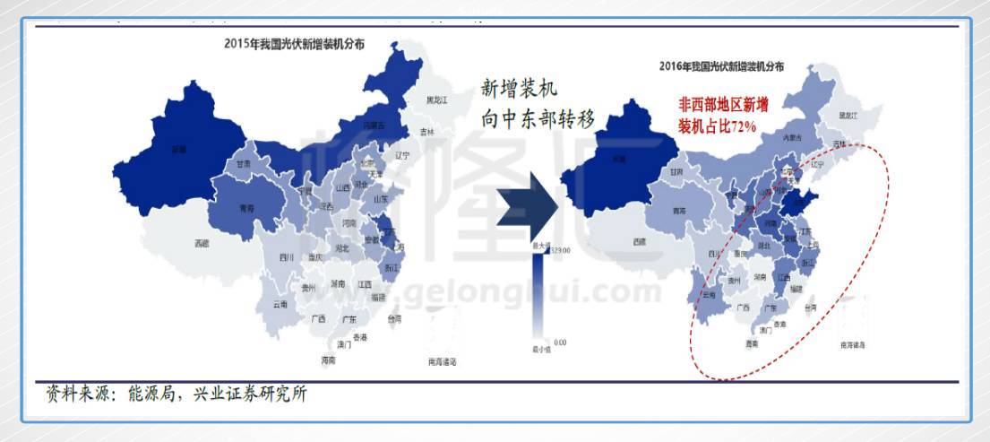 再從新增裝機布局看,由西北地區(qū)向中東部地區(qū)轉(zhuǎn)移的趨勢更加明顯。華東地區(qū)新增裝機為825萬千瓦,同比增加1.5倍,占全國的34%。華中地區(qū)新增裝機為423萬千瓦,同比增長37%,占全國的17.3%。西北地區(qū)新增裝機為416萬千瓦,同比下降50%。分布式光伏發(fā)展繼續(xù)提速,上半年浙江、山東、安徽三省新增裝機均超過100萬千瓦,同比增長均在2倍以上,三省分布式光伏新增裝機占全國的54.2%。