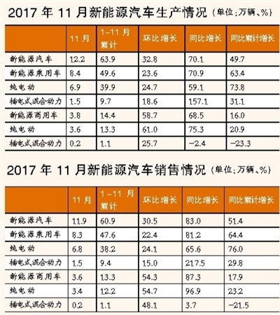 中國儲能網(wǎng)訊:中國汽車工業(yè)協(xié)會(簡稱“中汽協(xié)”)12月11日發(fā)布的數(shù)據(jù)顯示,11月,新能源汽車產(chǎn)銷分別完成12.2萬輛和11.9萬輛,環(huán)比分別增長32.8%和30.5%,同比分別增長70.1%和83%。中汽協(xié)秘書長助理許海東在現(xiàn)場預(yù)測,“今年完成新能源汽車70萬輛的銷售目標(biāo)肯定沒問題,2018年的新能源汽車銷量有望破百萬?!?/span>