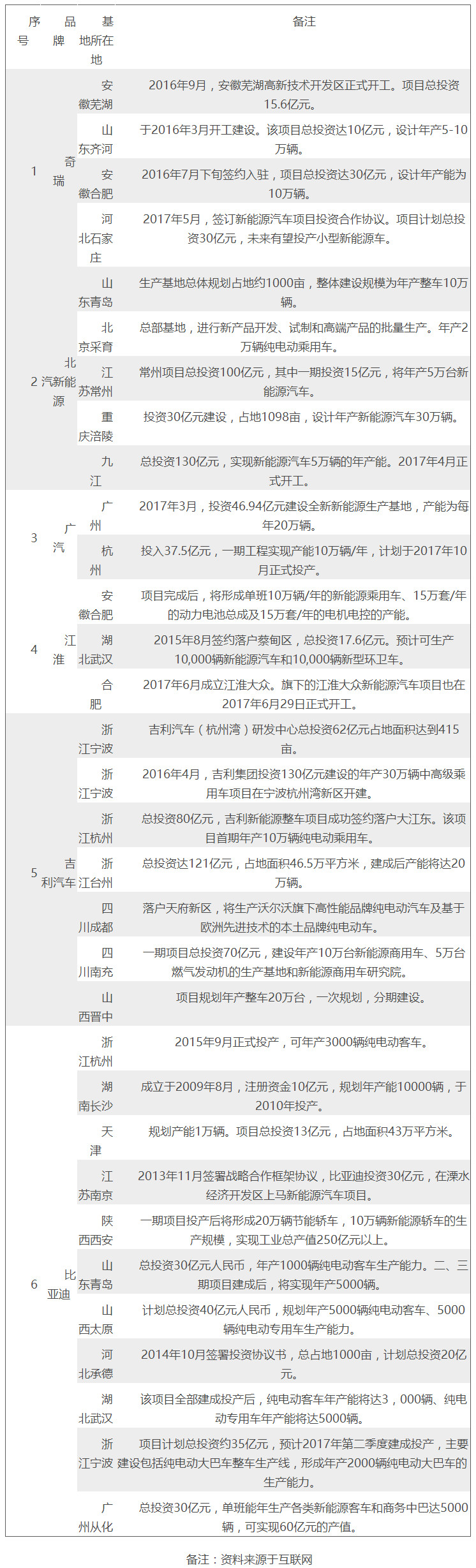可見,受市場需求直接影響,純電動(dòng)汽車產(chǎn)銷情況明顯優(yōu)于插電式混合動(dòng)力汽車,并且前者增速也遠(yuǎn)高于后者。國內(nèi)主要新能源車企生產(chǎn)基地見下表: