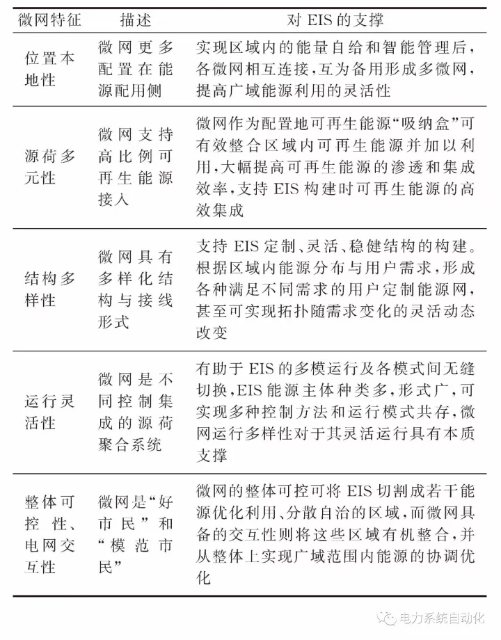 微網經十幾年的發(fā)展,具備了EIS所有必備要素,如多能互補、雙向能流、借助微網能量管理技術實現(xiàn)雙向信息流指導微網優(yōu)化運行等,可自主實現(xiàn)“細胞”內能量平衡,初步實現(xiàn)了EIS功能化,因而建設微網是構建EIS的優(yōu)選和先遣方案。每個獨立微網是廣域EIS的“有機細胞”,宏觀上“細胞”可看作整體可控的虛擬源/荷,互連而成的“細胞群”具有更大靈活性和可控性。微網具有的六大特征與EIS的建設要點高度契合,具體如表1所示。