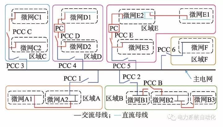 微網需通過“細胞”間的互聯(lián)才能組成EIS這一有機“組織”。本文將微網互聯(lián)形式分成三類,并給出含三種微網互聯(lián)形式的典型EIS場景,如圖2所示。
