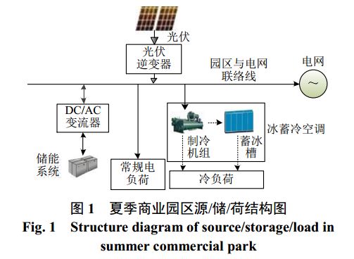 本文所述的商業(yè)園區(qū)夏季典型源/儲/荷結(jié)構(gòu)如圖1所示,主要包括分布式光伏發(fā)電系統(tǒng)、光伏逆變器、儲能系統(tǒng)、儲能DC/AC變流器、常規(guī)電負(fù)荷、冰蓄冷空調(diào)、冷負(fù)荷、園區(qū)與電網(wǎng)聯(lián)絡(luò)線、大電網(wǎng)。冰蓄冷空調(diào)的制冷機組利用從園區(qū)與電網(wǎng)聯(lián)絡(luò)線獲取的電能制冷,將冷量直接供給冷負(fù)荷或送至蓄冰槽存儲,蓄冰槽存儲的冷量可通過換熱裝置供給冷負(fù)荷。當(dāng)園區(qū)中分布式光伏發(fā)電系統(tǒng)不足以向負(fù)荷供電時,則從大電網(wǎng)購電,分布式發(fā)電為負(fù)荷供電后如有富余,則可向電網(wǎng)反送電。