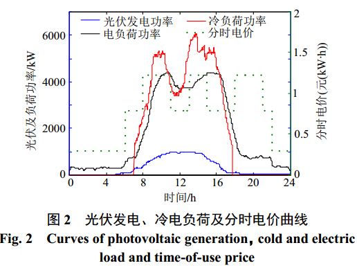 電負(fù)荷及分時電價曲線圖。從圖2看出,光伏主要出力時段為早晨6點左右至下午6點左右,中午時刻達(dá)到峰值??照{(diào)冷負(fù)荷從早上8點左右隨著樓內(nèi)人員工作的開始而迅速上升至高峰,12點左右午休時間有所下降,17點左右又隨著樓內(nèi)人員工作的結(jié)束迅速下降;電負(fù)荷的變化規(guī)律與此類似,在晚上10點至次日清晨最低,僅供維持基礎(chǔ)設(shè)備的運行以及外部照明。結(jié)合分時電價來看,冷電負(fù)荷高需求時段基本處于電價高峰期,因此通過儲能配置進行削峰填谷和能量再分配具有重要的經(jīng)濟價值和研究意義。