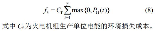 目前煤電在我國能源結(jié)構(gòu)中仍占有較大比重,為降低燃煤發(fā)電帶來的環(huán)境成本(環(huán)境控制成本,環(huán)境保護成本),第3個目標(biāo)函數(shù)是發(fā)電側(cè)給園區(qū)供電產(chǎn)生的環(huán)境損失費用最少,此時商業(yè)園區(qū)從電網(wǎng)側(cè)購電量最少,不考慮園區(qū)多余電能外送情況。