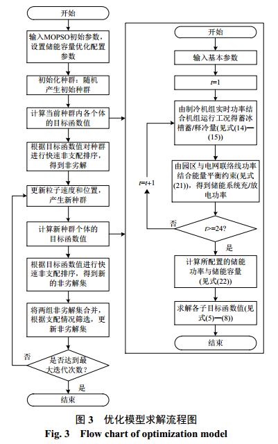 中國儲能網(wǎng)訊:摘要:科技園等商業(yè)園區(qū)的用電負(fù)荷類型多樣,用電特征和規(guī)律與傳統(tǒng)高耗能工廠園也有較大區(qū)別。通過分析商業(yè)園區(qū)多負(fù)荷特征和人員作息規(guī)律,基于分時電價機制采取低谷儲能峰平釋能的運行策略動態(tài)調(diào)整冷負(fù)荷側(cè)制冷機組功率和園區(qū)與電網(wǎng)聯(lián)絡(luò)線功率,既實現(xiàn)了對蓄冰槽出力的優(yōu)化調(diào)度,同時由園區(qū)能量平衡原則得到儲能系統(tǒng)的實時充放電功率,實現(xiàn)對儲能功率和容量的配置。建立基于能效、經(jīng)濟、環(huán)境的多目標(biāo)優(yōu)化模型,分別實現(xiàn)蓄能裝置的循環(huán)電量和循環(huán)冷量最小、儲能系統(tǒng)成本及購電費用之和最少和環(huán)境污染成本最小。采用基于動態(tài)慣性權(quán)重的多目標(biāo)非支配粒子群算法對所建模型進行求解,對生成的Pareto解集使用模糊隸屬度法篩選得到最優(yōu)解。通過上海某商業(yè)園區(qū)算例驗證了所提方法的有效性和可行性。