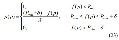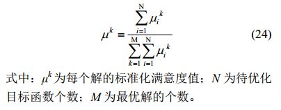式中:μ(p)為每個解中單個目標(biāo)函數(shù)滿意度值;Pmin和δ分別為Pareto最優(yōu)解集中該目標(biāo)函數(shù)的最小值和函數(shù)取值范圍。當(dāng)μ=0時表示對某個目標(biāo)函數(shù)值完全不滿意,而當(dāng)μ=1時表示對某個目標(biāo)函數(shù)值完全滿意。對于Pareto最優(yōu)解集中的每個解,根據(jù)下式求解其標(biāo)準(zhǔn)化滿意度值,其中標(biāo)準(zhǔn)化滿意度值最大的解即為最終所選解。