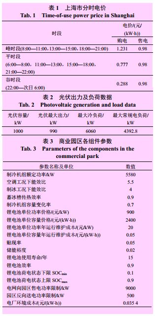 上海某商業(yè)園區(qū)所用儲能裝置為鋰電池,表1為上海市分時電價,園區(qū)內(nèi)典型日光伏出力及負(fù)荷特征曲線見圖2,具體數(shù)據(jù)見表2。園區(qū)中各組件參數(shù)如表3所示。
