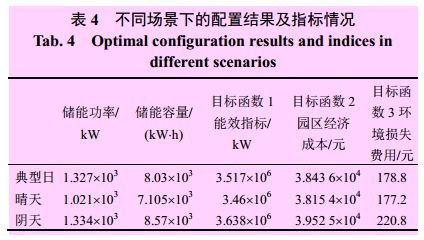 圖4中:1)由優(yōu)化算法得到的Pareto前沿是一系列互不支配的非劣解集合,不存在使所有目標(biāo)均達(dá)到最優(yōu)的解,決策者可根據(jù)實際規(guī)劃和側(cè)重選擇合適的配置結(jié)果。本文采用3.7節(jié)中所述的通過模糊隸屬度函數(shù)求取Pareto最優(yōu)解集中每個解的滿意度的方法,選擇綜合滿意度值最大的解作為最優(yōu)解。2)不同場景下的儲能系統(tǒng)多目標(biāo)優(yōu)化配置得出的pareto解集各不相同,結(jié)合表4可知,晴天光伏輻照充足,出力較大,園區(qū)內(nèi)凈負(fù)荷(實際負(fù)荷與光伏出力的差值)減小,所需配置的儲能功率和儲能容量較典型日有所降低,3個優(yōu)化目標(biāo)數(shù)值也相應(yīng)減小。陰天光伏板接收的輻射減少,出力較小,儲能配置容量及各項指標(biāo)均有增加??梢姴煌墓夥隽η闆r會影響儲能的充放電功率和容量配置。