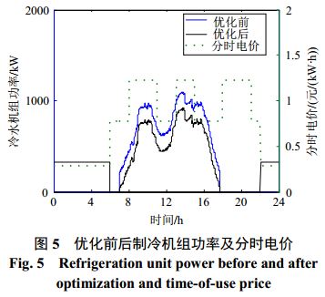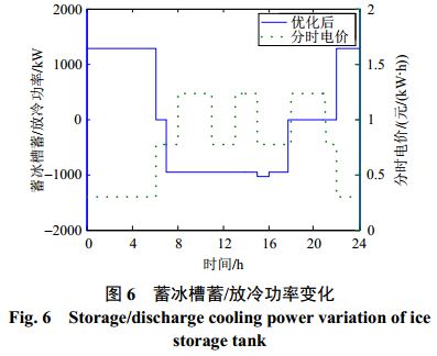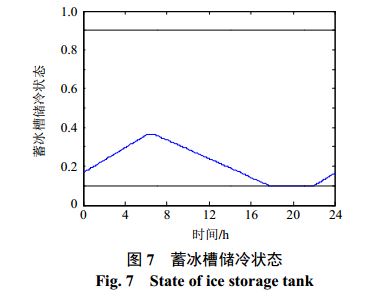 由上圖看出,蓄冰槽在電價低谷時段勻速蓄冷,對冷負(fù)荷側(cè)起到填谷作用的同時保證制冷機組功率的穩(wěn)定;在電價非谷時段釋冷,與制冷機組共同承擔(dān)冷負(fù)荷需求從而減小對電網(wǎng)的依賴程度。圖7中的蓄冰槽儲冷狀態(tài)表示實時蓄冷量與蓄冰槽額定容量的比值,在優(yōu)化調(diào)度過程中實時蓄冷量始終保持在允許范圍內(nèi)(與額定容量比值處于0.1—0.9之間)。