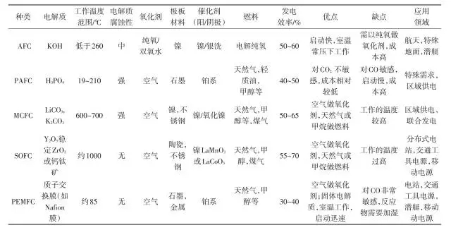 根據(jù)電解質(zhì)的不同,燃料電池可以分為堿性燃料電池(AFC)、磷 酸 燃 料 電 池(PAFC)、熔 融 碳 酸 鹽 燃 料 電 池(MCFC)、固體氧化物燃料電池(SOFC)和質(zhì)子交換膜燃料電池(PEMFC)5 種,其性能比較和發(fā)電原理如表 1 [7-8] 所示。