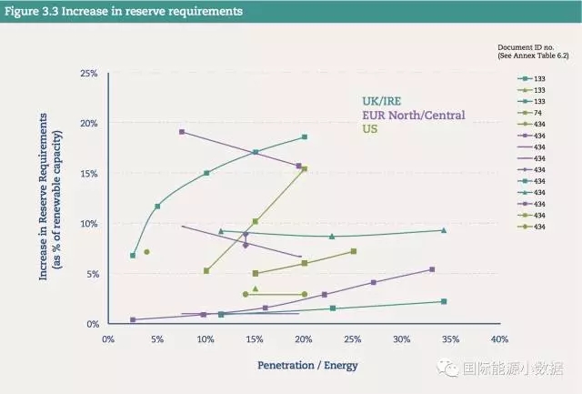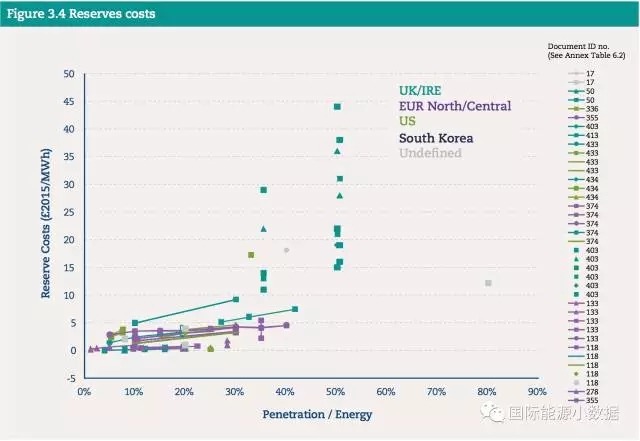 風(fēng)電光伏的系統(tǒng)成本首先要考慮相應(yīng)增加備用電源容量(reserve requirements)。如果風(fēng)電光伏發(fā)電占到電力需求的30%情況下,因為備用電源要求增加的成本約為5英鎊/兆瓦時(合人民幣4.3分/千瓦時)。