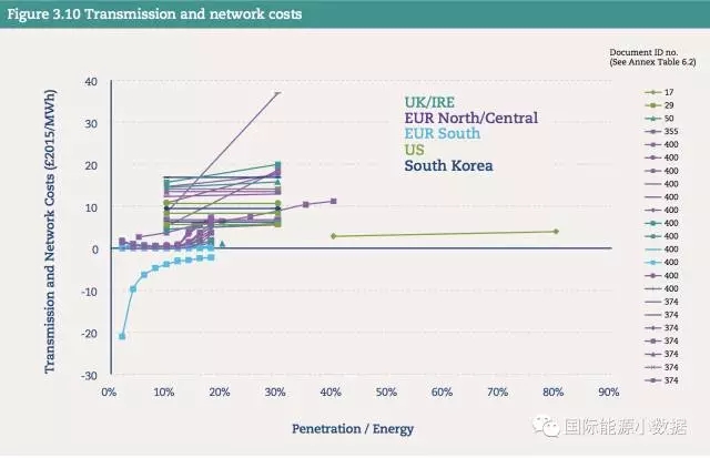 第三項要考慮的系統(tǒng)成本因素是因為吸納間歇性可再生能源電網(wǎng)所需要的“加固”和“靈活性”改造,此項成本約在5-20英鎊/兆瓦時(合人民幣0.04-0.17元/千瓦時)。越是不靈活的電網(wǎng),改造成本就越高。但是由于電網(wǎng)本身需要不斷的技術(shù)改造,并和周邊地區(qū)或國家聯(lián)網(wǎng),所以電網(wǎng)改造的成本并不應(yīng)該全部算在可再生能源頭上。