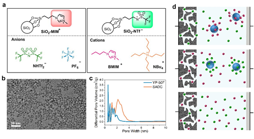 圖1.策略示意圖。a:二氧化硅接枝離子以及自由離子結(jié)構(gòu)示意圖;b:二氧化硅透射電鏡圖;c:活性炭孔徑分布圖;d:活性炭在三種不同電解液中的儲(chǔ)能示意圖,從上到下依次為陰離子自由、陽(yáng)離子固定,陽(yáng)離子自由、陰離子固定,陰陽(yáng)離子均自由