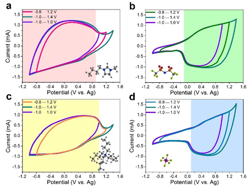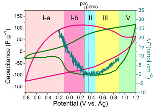 基于以上方法,研究團(tuán)隊(duì)發(fā)現(xiàn),以商用活性炭YP-50F為電極,可以表征陽(yáng)離子BMIM+、NBu4+和陰離子NTf2–、PF6–各自貢獻(xiàn)的容量以及每種離子貢獻(xiàn)容量的特定電壓窗口。使用石英晶體微天平(EQCM),研究人員進(jìn)一步表征了活性炭YP-50F在離子液體(BMIM-NTf2)的儲(chǔ)能機(jī)理,并結(jié)合BMIM+和NTf2–各自的電化學(xué)性質(zhì),對(duì)儲(chǔ)能機(jī)理進(jìn)行了更深層次的解釋。