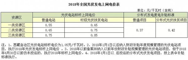 2018年1月1日以后投運(yùn)的、采用“自發(fā)自用、余量上網(wǎng)”模式的分布式光伏發(fā)電項(xiàng)目,全電量度電補(bǔ)貼標(biāo)準(zhǔn)降低0.05元,即補(bǔ)貼標(biāo)準(zhǔn)調(diào)整為每千瓦時(shí)0.37元(含稅)。采用“全額上網(wǎng)”模式的分布式光伏發(fā)電項(xiàng)目按所在資源區(qū)光伏電站價(jià)格執(zhí)行。