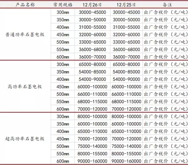 12月26日石墨電極主流成交參考價(jià)格(元/噸)