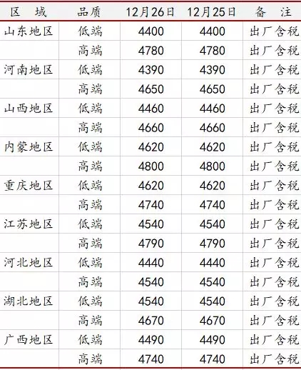 12月26日各地區(qū)石油焦價(jià)格情況(元/噸)