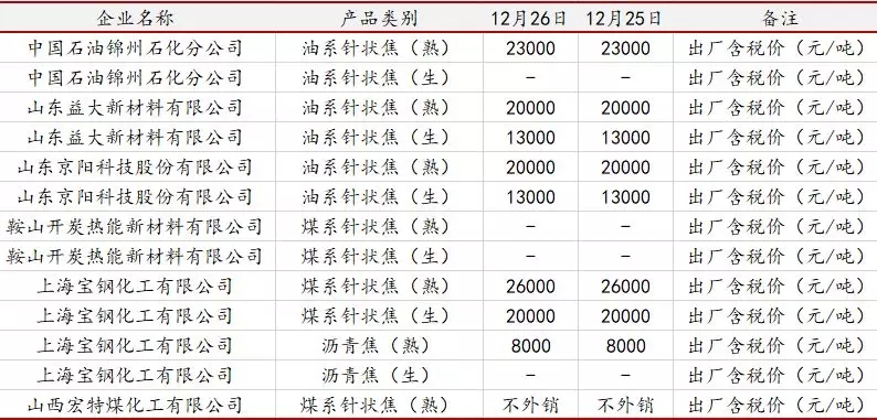 12月26日針狀焦主流成交參考價(jià)格(元/噸)