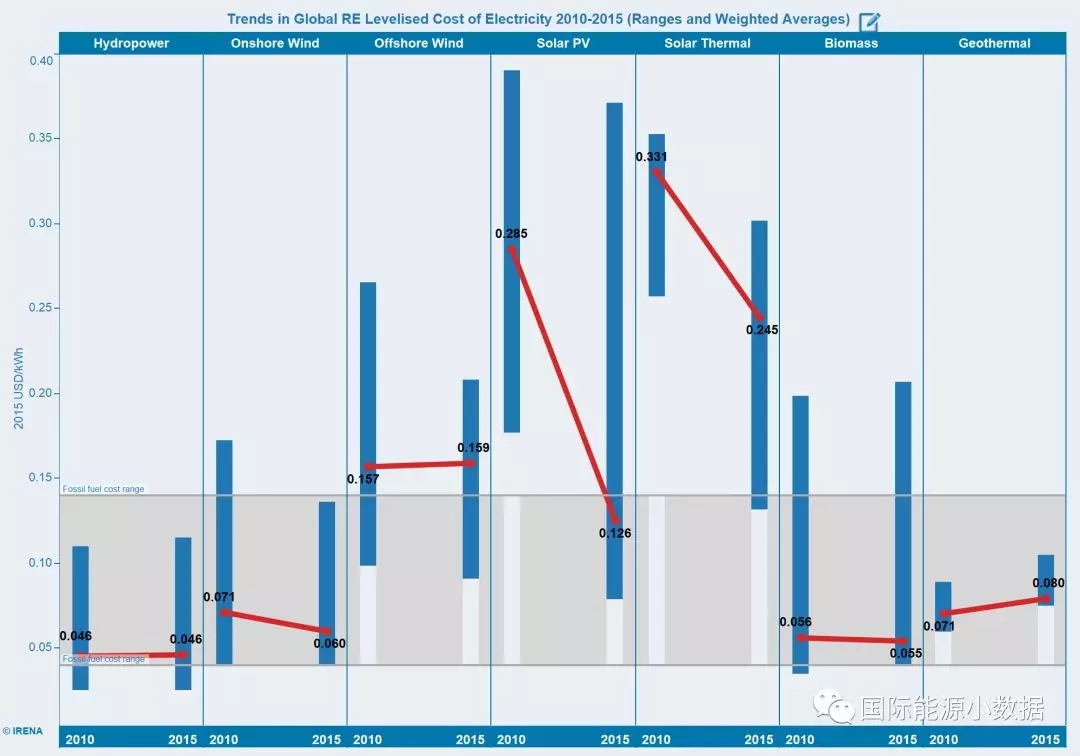 光伏:2010=0.285美元/千瓦時;2015年=0.126美元/千瓦時——下降幅度55.8%