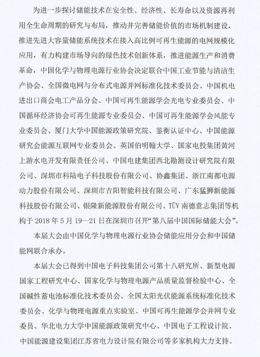 為進(jìn)一步探討儲能技術(shù)在安全性、經(jīng)濟性、長壽命以及資源再利用全生命周期的研究與布局,推動并完善儲能價值的市場機制建設(shè),推進(jìn)先進(jìn)大容量儲能系統(tǒng)技術(shù)在接入高比例可再生能源的電網(wǎng)規(guī)模化應(yīng)用,有力構(gòu)建市場導(dǎo)向的綠色技術(shù)創(chuàng)新體系,推進(jìn)能源生產(chǎn)和消費革命,中國化學(xué)與物理電源行業(yè)協(xié)會決定聯(lián)合中國工業(yè)節(jié)能與清潔生產(chǎn)協(xié)會、全國微電網(wǎng)與分布式電源并網(wǎng)標(biāo)準(zhǔn)化技術(shù)委員會、中國機電進(jìn)出口商會電工產(chǎn)品分會、中國可再生能源學(xué)會光伏專業(yè)委員會、中國循環(huán)經(jīng)濟協(xié)會可再生能源專業(yè)委員會、中國可再生能源學(xué)會風(fēng)能專業(yè)委員會、廈門大學(xué)中國能源政策研究院、鑒衡認(rèn)證中心、中國能源研究會能源互聯(lián)網(wǎng)專業(yè)委員會、英國伯明翰大學(xué)、國家電投集團黃河上游水電開發(fā)有限責(zé)任公司、中國電建集團西北勘測設(shè)計研究院有限公司、深圳市科陸電子科技股份有限公司、協(xié)鑫集團、浙江南都電源動力股份有限公司、深圳市吉陽智能科技有限公司、廣東猛獅新能源科技股份有限公司、銀隆新能源股份有限公司、TüV南德意志集團等機構(gòu)于2018年5月19—21日在深圳市召開“第八屆中國國際儲能大會”。